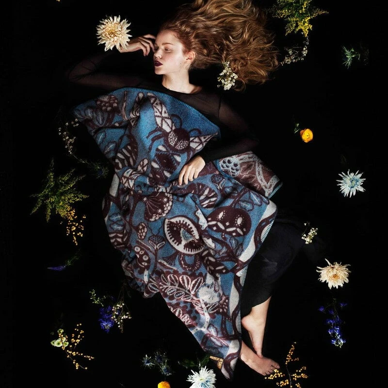 Die Decke Bees von Klaus Haapaniemi ist aus 100 % Wolle gewebt und mit einem ornamentalen Muster verziert, das Bienen, Pflanzen und reife Früchte zeigt. Die Decke wird mit einer Technik gewebt, die sie dick und weich, aber auch sehr leicht macht. Die Seiten der Decke sind mit einer Overlock-Naht versehen. An einer Ecke ist ein Markenzeichen aufgenäht. Die Größe beträgt 130 × 170 cm.