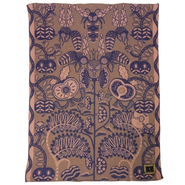 Die Decke Bees von Klaus Haapaniemi ist aus 100 % Wolle gewebt und mit einem ornamentalen Muster verziert, das Bienen, Pflanzen und reife Früchte zeigt. Die Decke wird mit einer Technik gewebt, die sie dick und weich, aber auch sehr leicht macht. Die Seiten der Decke sind mit einer Overlock-Naht versehen. An einer Ecke ist ein Markenzeichen aufgenäht. Die Größe beträgt 130 × 170 cm.