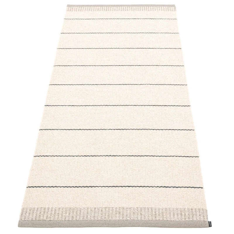Der vom schwedischen Teppichhersteller Pappelina entworfene Teppich Belle zeichnet sich durch den Kontrast von hellem Hintergrund und dünnen Streifen aus. Die doppelt gefalteten Kanten sind mit einer starken Naht gesäumt.