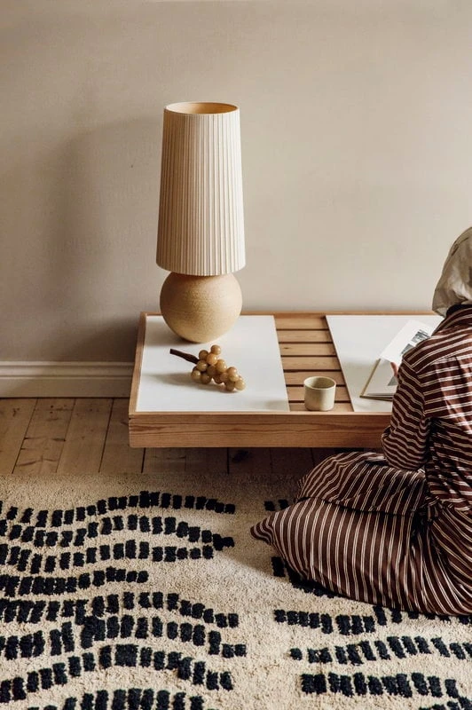 Der Teppich Dyyni von Finarte wurde vom finnischen Design-Duo Saana ja Olli entworfen und verleiht Ihrem Zuhause eine natürliche Note. Der beigefarbene Teppich ist mit einem schönen organischen Wellenmuster verziert und nach dem finnischen Wort für „Düne“ benannt, das Bilder von Sandstränden und ruhigen Wüstenlandschaften hervorruft. Der Dyyni-Teppich wird in Indien aus recycelter Baumwolle handgefertigt; das Material wird aus Abgeschnittenem, Überschüssen und Materialresten der lokalen Bekleidungsindustrie gewonnen.