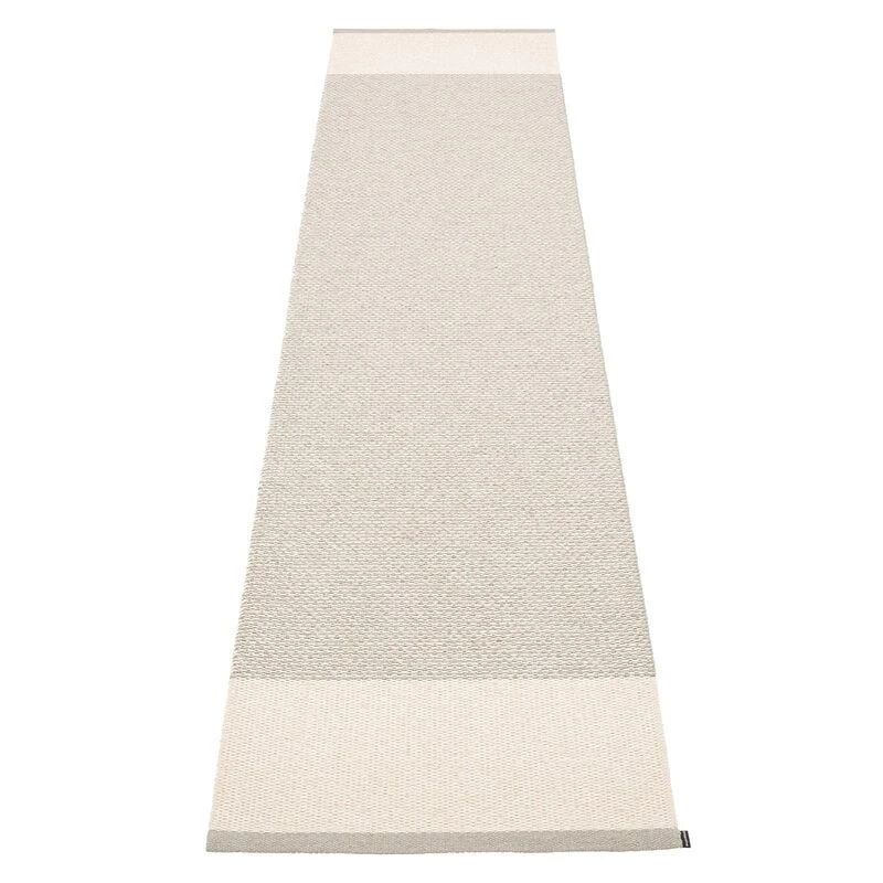 Der aus phthalatfreiem PVC-Flachband gefertigte Kunststoffteppich ist leicht zu reinigen und eine praktische Ergänzung in allen Räumen. Aufgrund seiner schmalen Form lässt sich der Teppich leicht als eindrucksvoller Läufer im Flur, in der Küche oder im Außenbereich verwenden. Der Edit-Teppich wird im schwedischen Dalarna unter Anwendung traditioneller Techniken gewebt.