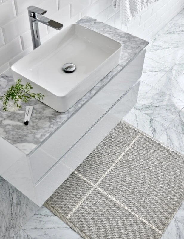 Der aus phthalatfreiem PVC-Flachband gefertigte Teppich ist leicht zu reinigen und eine praktische Ergänzung in allen Räumen. Aufgrund seiner schmalen Form lässt sich der Teppich leicht als eindrucksvoller Läufer im Flur, in der Küche oder im Außenbereich verwenden. Der Fred-Teppich wird im schwedischen Dalarna unter Anwendung traditioneller Techniken gewebt.