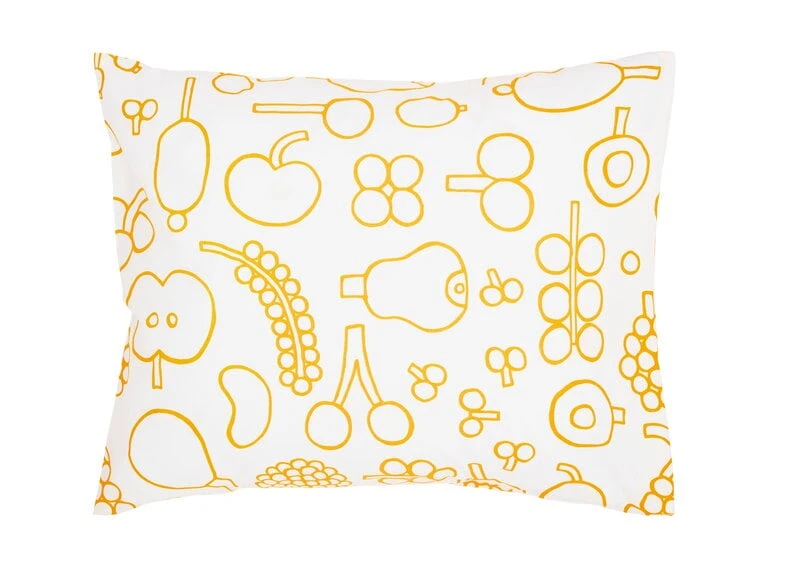 Das Bettbezug-Set aus der „Oiva Toikka“-Kollektion von Iittala ist mit dem verspielten Frutta-Muster verziert. Der Bettbezug und der Kopfkissenbezug bestehen aus Baumwollperkal, einem Material, das häufig für Hotelbettwäsche verwendet wird, da es sich weich und kühl auf der Haut anfühlt.