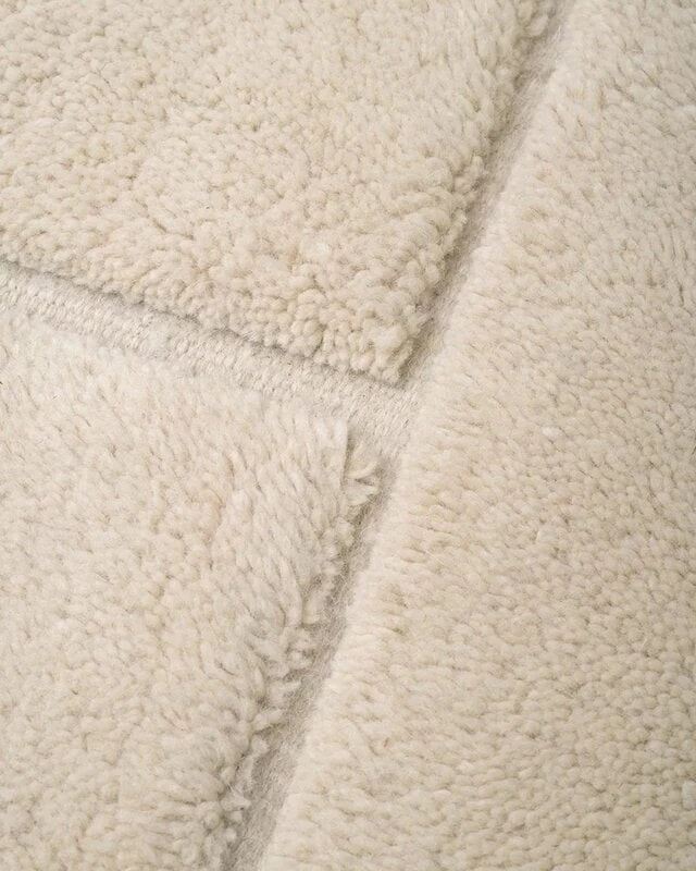 Der Line-01-Teppich von Woven Works besticht durch die besonders weiche, hochflorige Wolle und die schlichte, geometrische Linienführung. Der cremeweiße Fransenteppich aus Wolle ist durch gerillte Linien in Abschnitte unterteilt, die dem Teppich einen interessanten dreidimensionalen Ausdruck verleihen. Das Design wird durch geflochtene Fransen an den Ecken vervollständigt.