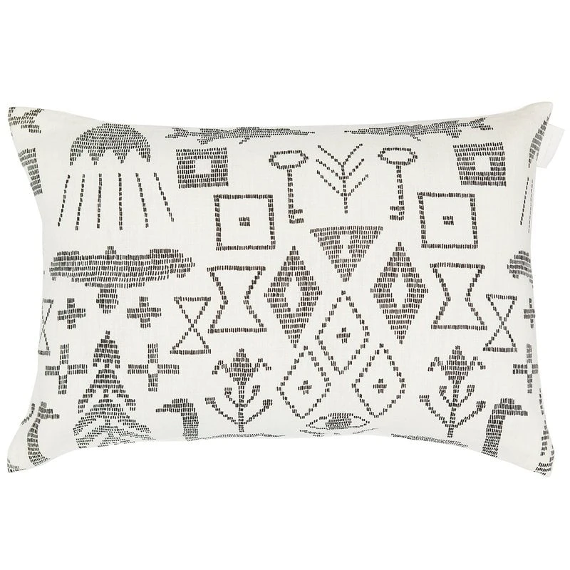 Der Maailman-synty-Kissenbezug von Saana ja Olli zeigt einen Druck, der von alten finnischen Wandteppich-Traditionen inspiriert ist. „Maailman synty“ (Die Geburt der Welt) ist die Illustration alter Schöpfungsmythen in einem grafischen Muster aus Symbolen und Figuren.