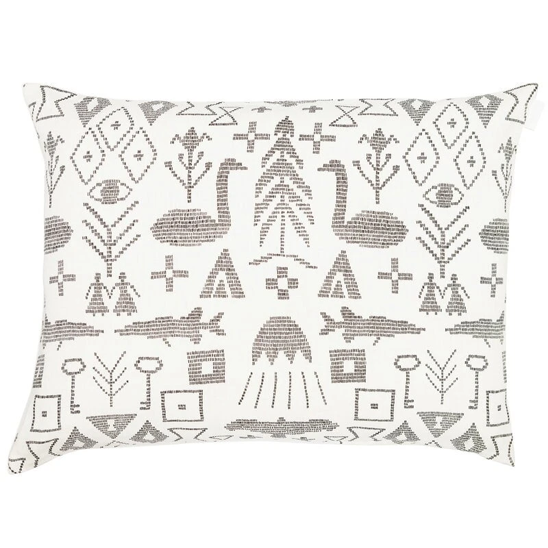 Der Kissenbezug Maailman synty von Saana ja Olli zeigt einen Druck, der von alten finnischen Wandteppich-Traditionen inspiriert ist. Maailman synty („Die Geburt der Welt“) ist die Illustration alter Schöpfungsmythen in einem grafischen Muster aus Symbolen und Figuren.