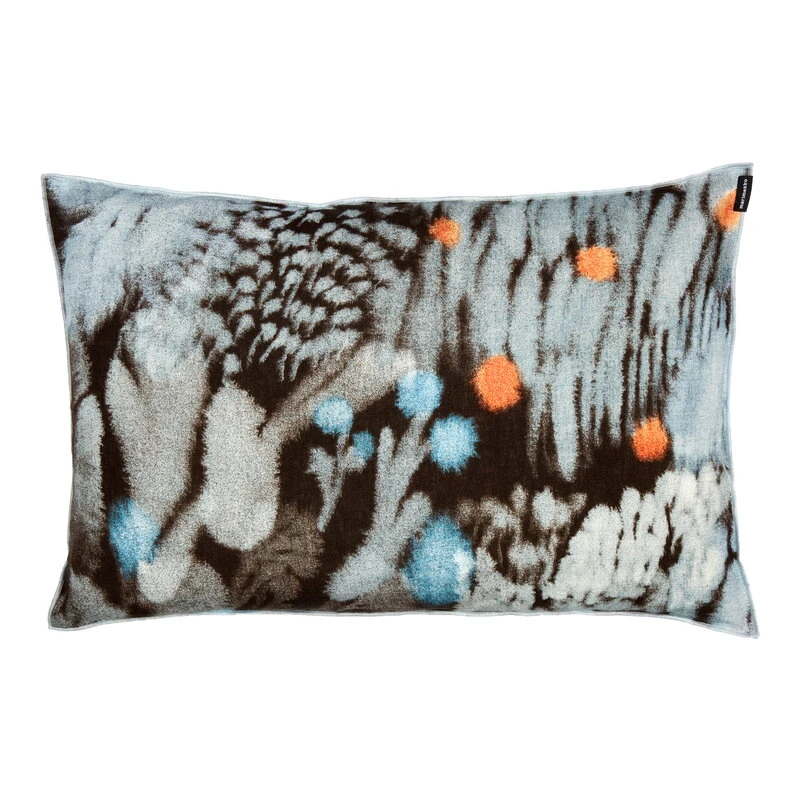 Der Kuisma-Kissenbezug von Marimekko ist mit einem wunderschönen Muster von Aino-Maija Metsola verziert, auf dem sich die letzten Herbstblumen leise im Wind wiegen und die Blätter bereits eingerollt sind. Die neblige und stimmungsvolle Optik des Musters wird durch das Malen mit Wasserfarben auf nassem Papier erreicht.
