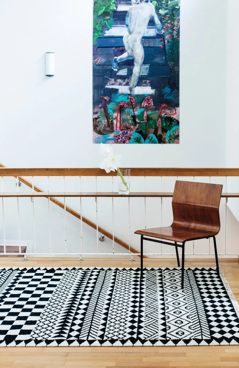 Das Muster des wunderschönen handgefertigten Teppichs von MUM’s kombiniert skandinavisches Design mit einem traditionelleren Dekorationsstil. Die Inspiration für das Muster stammt aus einem afrikanischen Dorf, in dem jedes Haus wie ein Kunstwerk ist. Der Wollteppich wurde in Finnland entworfen und in Bhadohi (Indien) handgefertigt.