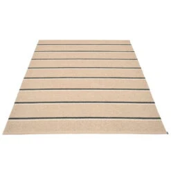 Der Teppich Olle von Pappelina zeichnet sich durch eine erdige Hintergrundfarbe mit einem Streifenmuster in verschiedenen Farbtönen aus. Die doppelt gefalteten Kanten sind gesäumt, um Stärke und Haltbarkeit zu gewährleisten.