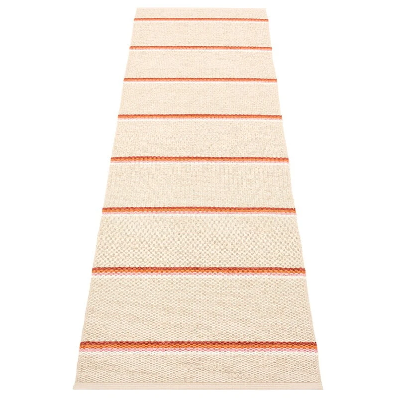 Der aus phthalatfreiem PVC-Band gefertigte Teppich ist sehr pflegeleicht und damit eine praktische Wahl für alle Räume, vom Kinderzimmer bis zur Küche. Dank seiner schmalen Form ist der Teppich auch ein idealer Flurläufer, und er kann sogar im Freien auf dem Balkon, der Veranda oder der Terrasse eingesetzt werden. Der im schwedischen Dalarna hergestellte Teppich wurde mit traditionellen Techniken gewebt und ist in mehreren Farbvarianten erhältlich.