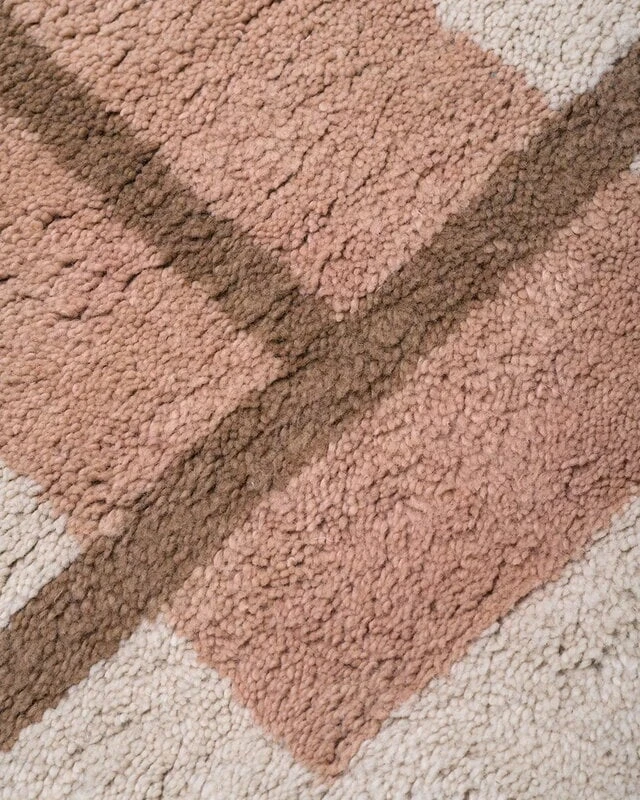 Der Patch-01-Teppich von Woven Works zeichnet sich durch eine zarte Komposition aus geometrischen Mustern und hochfloriger Wolle mit einer flauschigen, angenehm griffigen Textur aus. Die Farbpalette des Fransenteppichs aus Wolle kombiniert erdige Töne mit helleren Akzentfarben, und seine Ränder sind mit geflochtenen Fransen verziert.