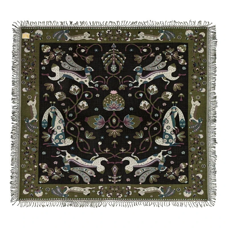 Den Rabbit-Überwurf von Klaus Haapaniemi schmückt eine ornamentale Kulisse aus hoppelnden Kaninchen und Pflanzenmotiven. Das große, Tuch mit Fransen kann als Kuscheldecke verwendet oder auf einem Bett oder Sofa ausgebreitet werden.