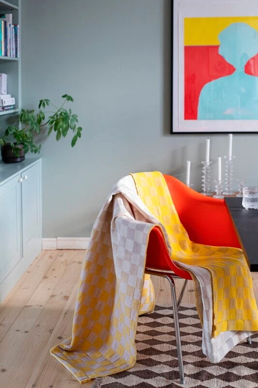 Die Shakki-Decke von Lapuan Kankurit ist mit einem grafischen, quadratischen Muster dekoriert, das von Ida Korrström entworfen wurde. Das Muster erinnert an ein Schachbrett – und „shakki“ ist das finnische Wort für „Schach“. Diese charmante Decke wird aus einer Mischung aus warmer Merinowolle und Baumwolle hergestellt, die sich auf der Haut wunderbar weich und luxuriös anfühlt. Beim Entspannen auf dem Sofa können Sie sich in die stilvolle Decke einkuscheln oder sich an einem kühlen Sommerabend auf der Terrasse darin einwickeln.