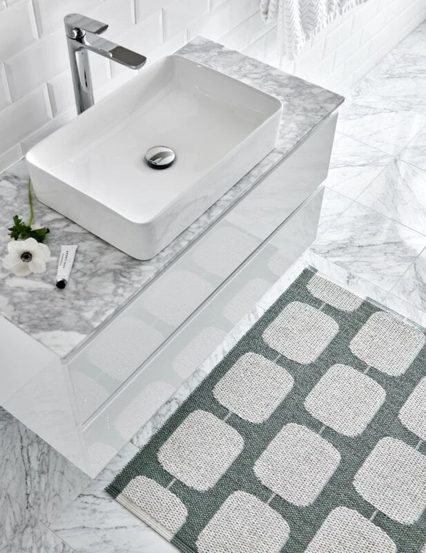 Der aus phthalatfreiem PVC-Flachband gefertigte Teppich ist leicht zu reinigen und eine praktische Ergänzung in allen Räumen. Aufgrund seiner schmalen Form lässt sich der Teppich leicht als eindrucksvoller Läufer im Flur, in der Küche oder im Außenbereich verwenden. Der Sten-Teppich wird im schwedischen Dalarna unter Anwendung traditioneller Techniken gewebt.