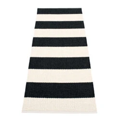 Die Kunststoffteppiche Bob von Pappelina werden auf einem traditionellen Webstuhl in Dalarna, Schweden, gewebt. Die aus phthalatfreiem PVC-Band hergestellten Teppiche sind langlebig und pflegeleicht, und ihr Streifenmuster verleiht jedem Raum Charakter. Dank seiner schmalen Form eignet sich der Teppich gut als eindrucksvoller Flurläufer, Küchenteppich oder als Teppich für den Außenbereich. Die Teppiche Bob sind an beiden Enden mit einer Logoprägung versehen.