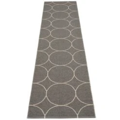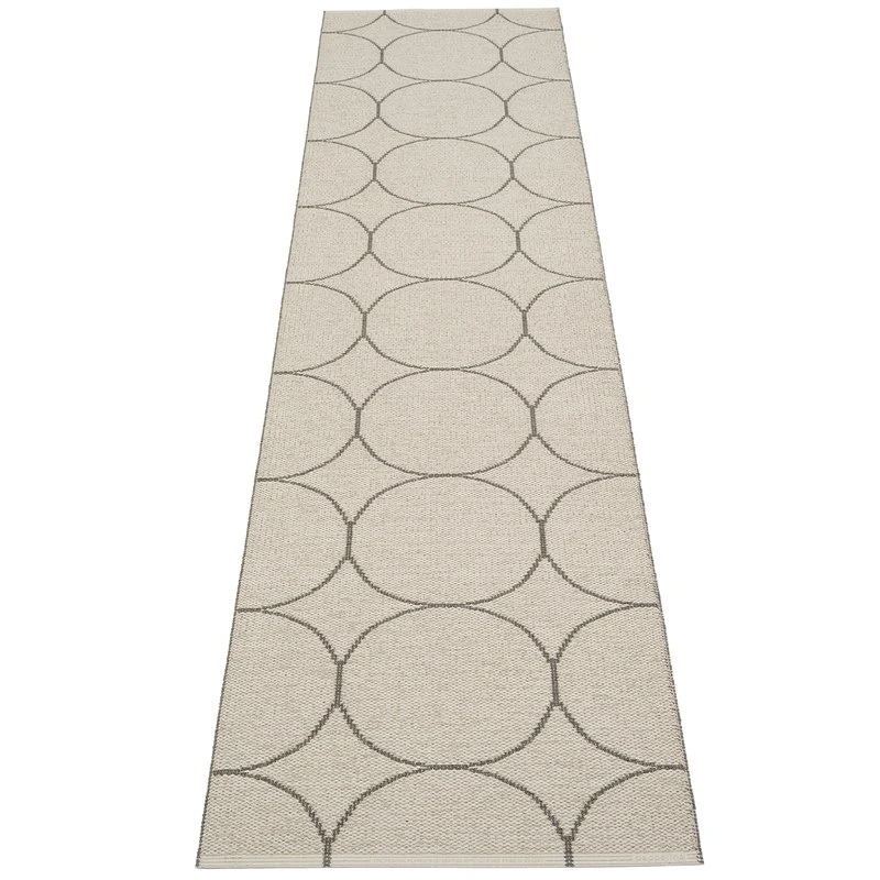 Die Boo-Kunststoffteppiche von Pappelina sind mit großen, grafischen Kreisen verziert. Sie werden auf einem traditionellen Webstuhl in Dalarna, Schweden, hergestellt. Die Teppiche sind wendbar und haben auf der anderen Seite ein entgegengesetztes Muster. Die aus phthalatfreiem PVC-Band hergestellten Teppiche sind langlebig und pflegeleicht. Sie passen mit ihren stilvollen zweifarbigen Mustern gut zu unterschiedlichen Einrichtungen. Dank seiner schmalen Form eignet sich der Teppich gut als eindrucksvoller Flurläufer, Küchenteppich oder als Teppich für den Außenbereich. Die Boo-Teppiche sind mit verschweißten Enden und einem geprägten Pappelina-Logo versehen.